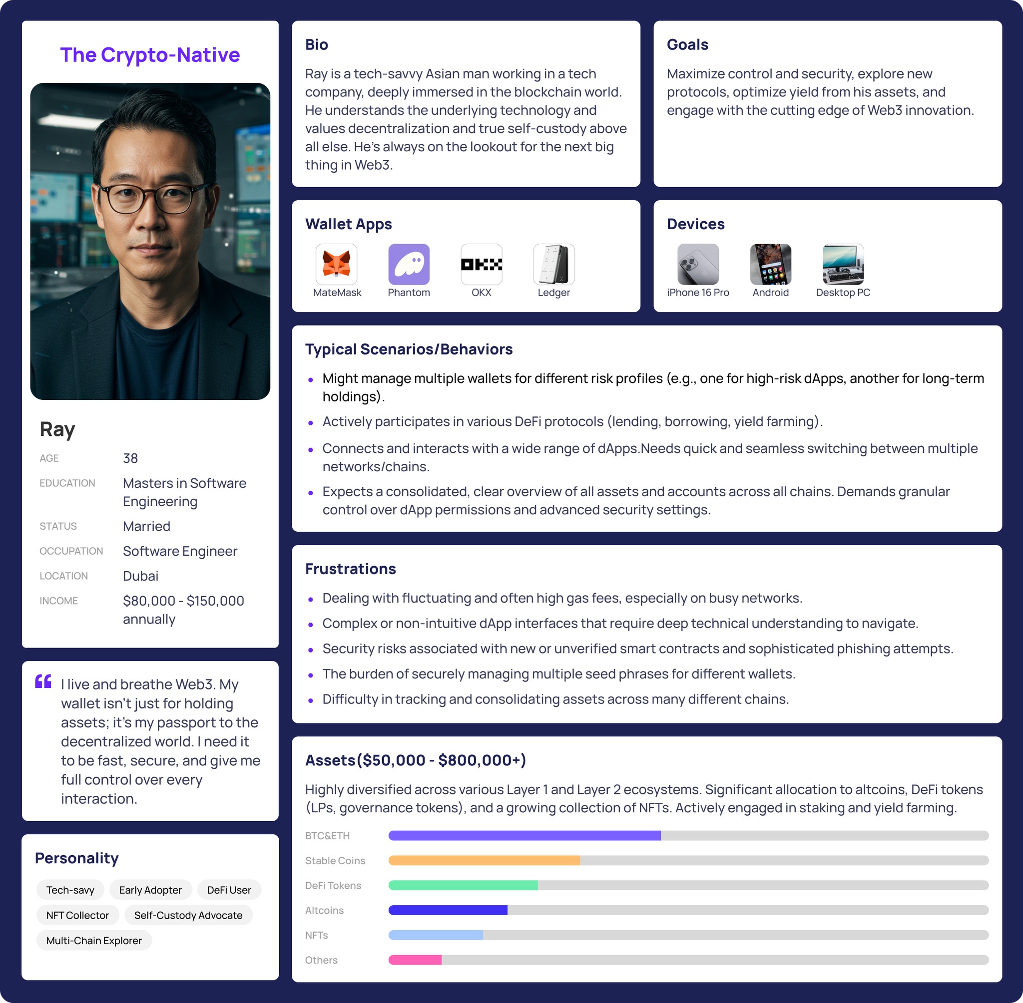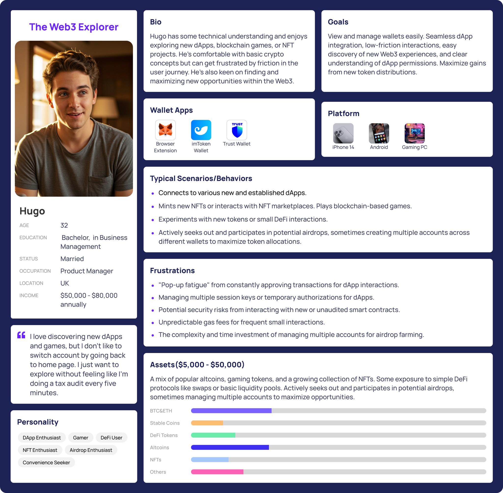 This user is enthusiastic and actively participates in the Web3 ecosystem, but they may not understand the deep technical details. They learn by doing. Their biggest challenges are poor feature discoverability and unclear navigation, which can stop their exploration journey in its tracks.