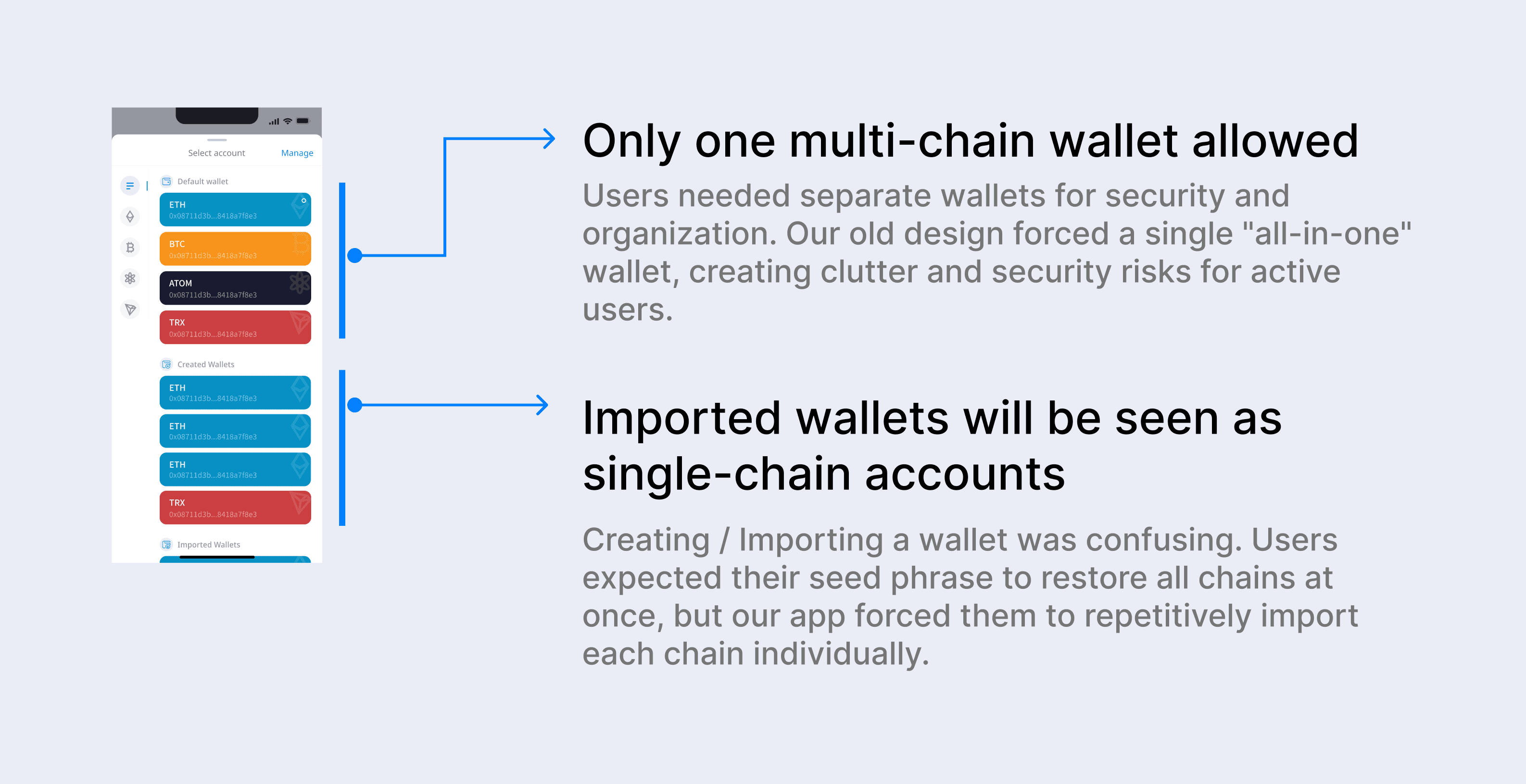 The original "Identity Wallet" created in the app functioned as a multi-chain wallet. However, any wallet a user imported was artificially restricted to a single chain. This inconsistent behavior created a confusing and unpredictable experience, breaking the user's mental model of how wallets should function.