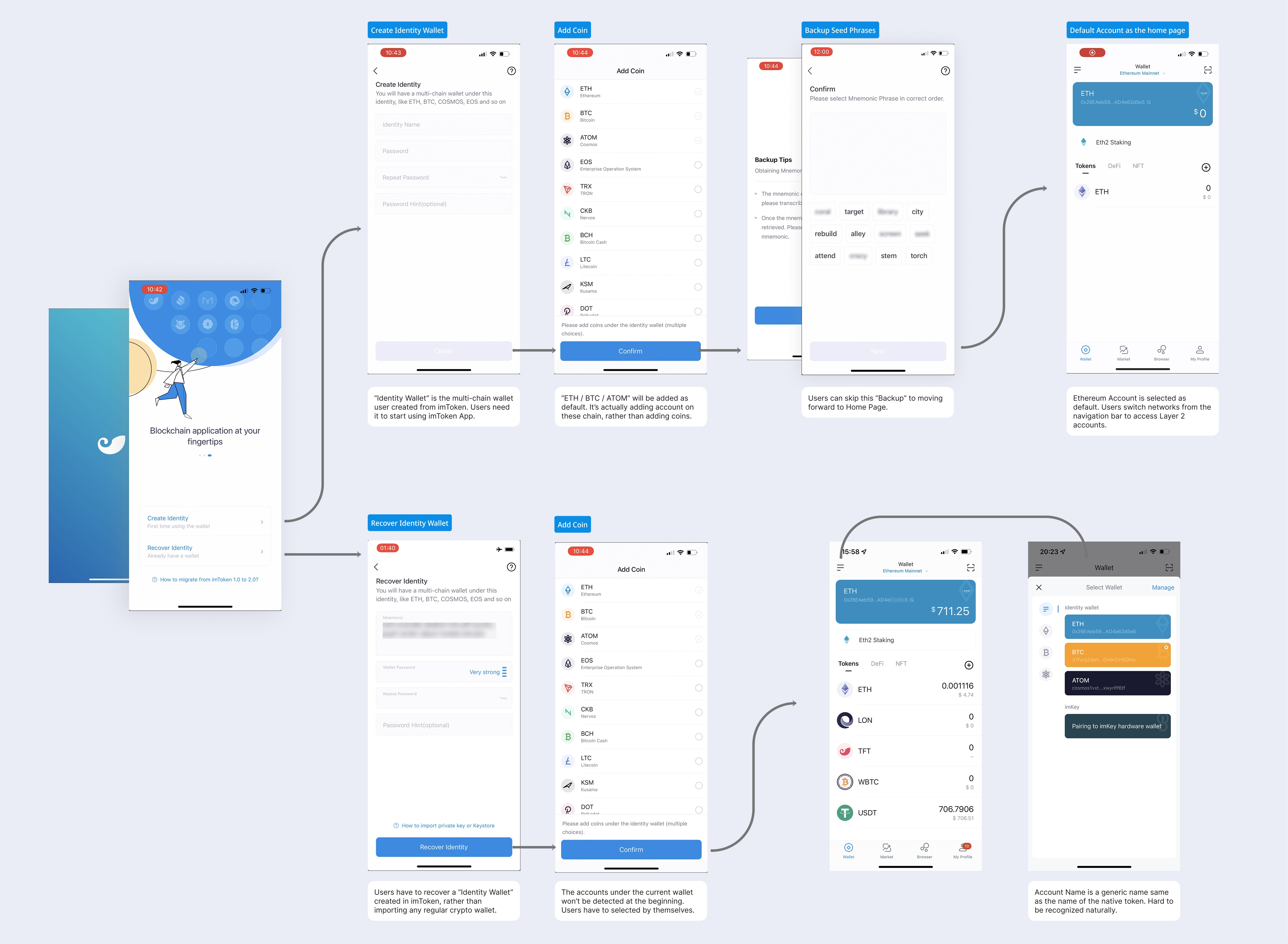 The primary goal of this project was to restructure imToken's core wallet and account management experience to support user growth. The original architecture was designed for crypto-savvy experts, but this created significant usability problems for new and exploratory user groups. Therefore, the project focused on two main objectives: