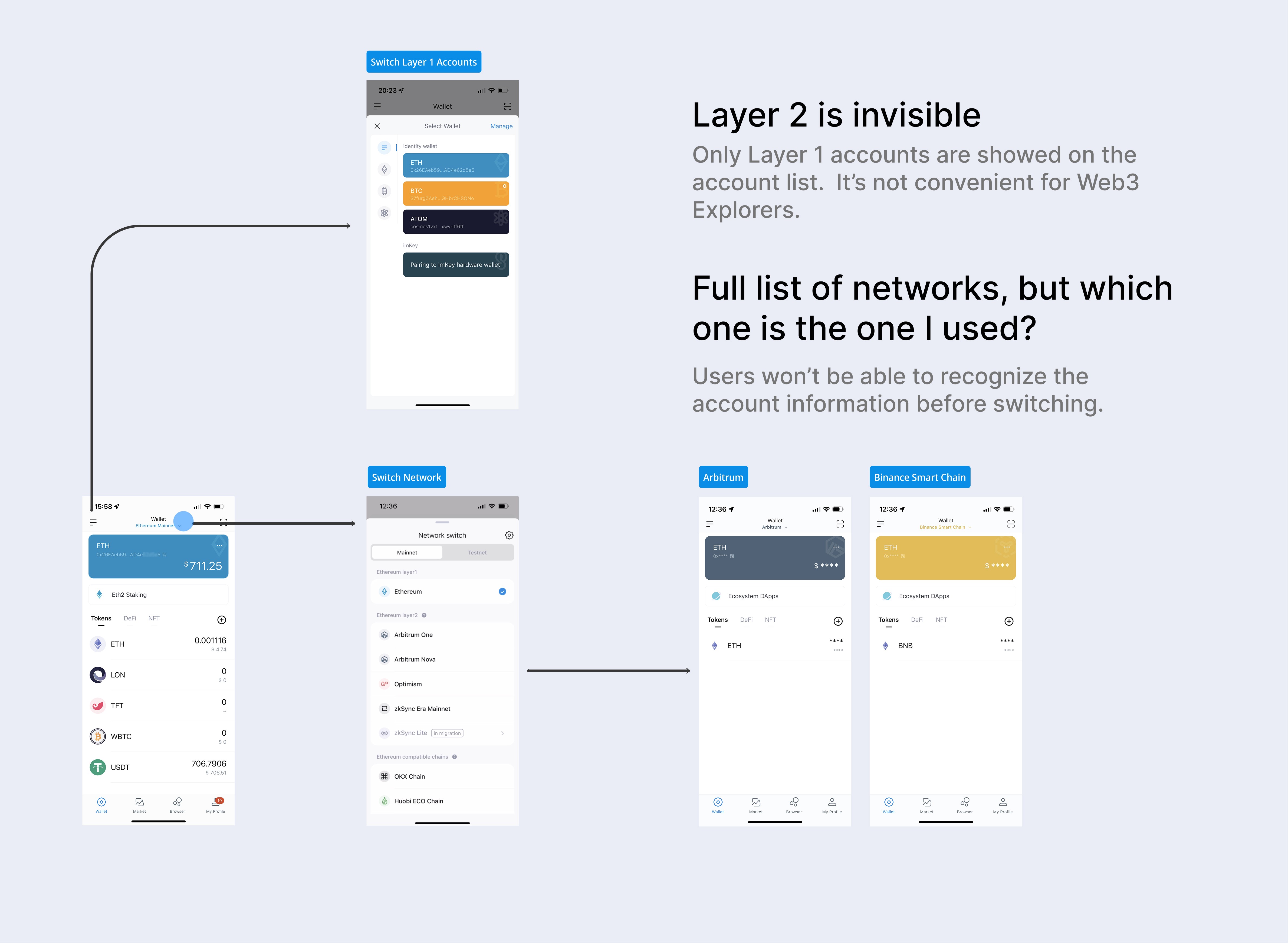 Address key issues like the confusing "Identity Wallet" concept, poor feature discoverability, invisible Layer 2 accounts, and ambiguous account naming to reduce friction and improve clarity.