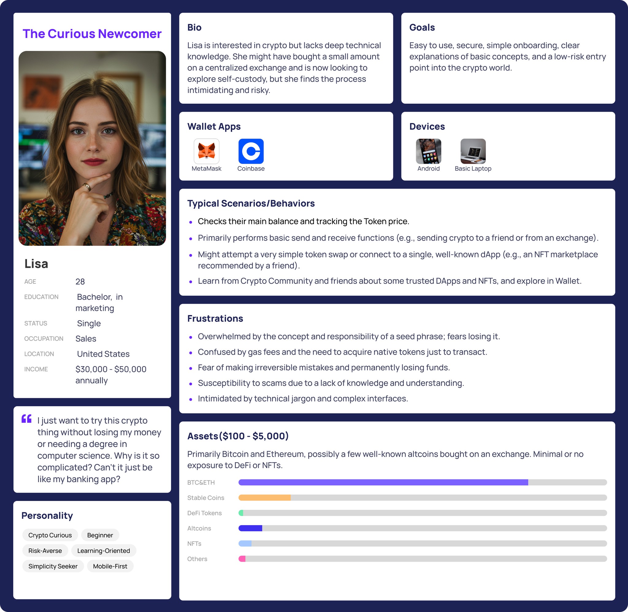 This user is new to the space and has a low tolerance for complexity and jargon. They are highly motivated by security and the fear of losing their funds. For them, a confusing interface isn't just an inconvenience—it's a reason to abandon the product entirely. They need clear guidance, simple language, and a reassuring experience.
